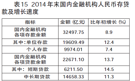 年末全市国内金融机构人民币存款余额32497.75亿元,比年初增长8.9%;国内金融机构人民币贷款余额22671.10亿元,比年初增长13.7%。