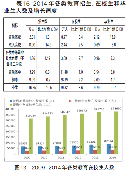 年末全市各级各类学校总数达2094所,比上年增加97所;毕业生38.65万人,招生数52.99万人,在校学生数175.33万人,分别增长5.2%、10.1%和6.8%。年末全市有幼儿园1402所,增加89所;在园幼儿39.90万人,增长8.2%。有小学331所,减少4所;在校学生79.32万人,增长8.6%。有普通中学325所,增加11所;在校学生37.87万人,增长1.9 %。学龄儿童入学率和小学毕业生升学率均保持在100 %,初中毕业生升学率79.9%。全年普通高等学校10所,招生2.81万人,增长1.6%;毕业生2.12万人,增长13.8%;在校学生8.77万人,增长6.4%。
