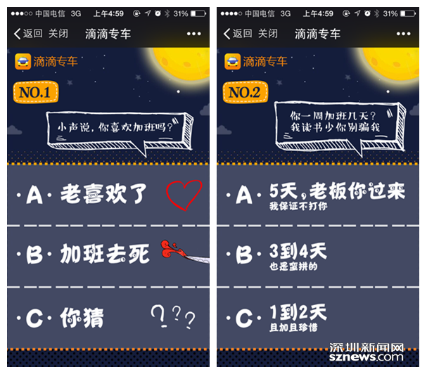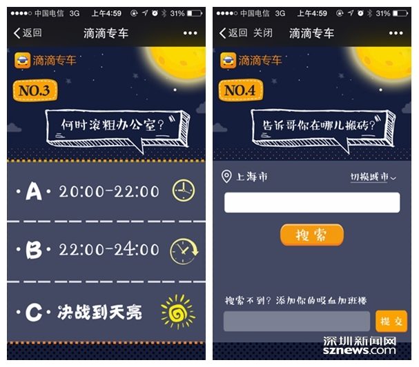 滴滴公司表示,本次活动结束后,加班排名前100办公楼的投票用户,有机会可获得5张面额分别为45元的滴滴专车券,滴滴带着免费专车来解救广大“加班狗”。