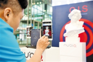 第二届中国电子信息博览会2014年4月10日在深圳开幕。图为博览会上,中兴参展人员演示努比亚手机光学防震拍摄功能(资料照片)。新华社发