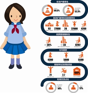 在学校建设方面,2014年,深圳新建92所幼儿园,新增2.7万个学位;新改扩建28所公办学校,新增3.7万个义务教育学位、4200个高中学位,70%位于原特区外。未来3年将投资100亿,新改扩建130所中小学校,新增16.3万个学位。市第八、九、十一高级中学连续开工。不仅如此,深圳还构建“631”学位供需协调机制,以区域内常住人口为基数,参照当年出生人口数,提前6年预测小一学位需求,提前3年规划学位建设,提前1年落实学位供给。