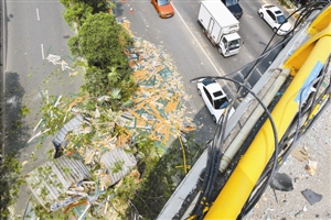 事发立交桥下,集装箱、地板碎屑等散落一地,曾一度阻塞交通。深圳晚报记者 陈远忠 摄