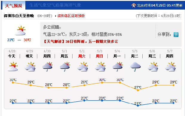 市气象台预计,五一假期(1~3日),深圳受偏南暖湿气流影响,仍然以多云天气为主,偶有分散阵雨,市民出门带把伞,遮阳又能挡雨,4~5日仍受弱冷空气和切变线影响,转为阴天有阵雨天气。