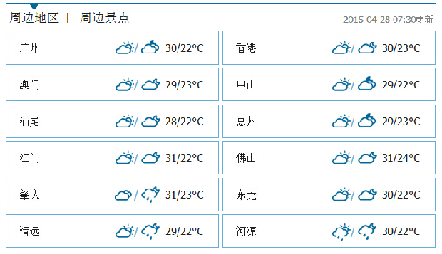 对于五一小长假期间有省内出游计划的朋友,请密切关注旅游当地的气象信息。据市气象台预计,从4月30日,粤北、珠三角北部和粤东市县有中到大雨局部暴雨,局地伴有雷电和短时大风等强对流天气。5月1~2日,粤北和中部偏北市县有中到大雨局部暴雨。3日,广东中北部市县中雨转阵雨。市气象台提醒市民慎选出游地,尽量避免强对流天气覆盖的区域。(记者邓媛)