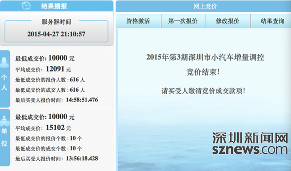 深圳新闻网4月27日讯(记者 陈飞)4月27日下午3点,深圳小汽车增量指标第三期竞拍结束。在本期竞拍中共拍出9223个增量指标,其中拍出的个人指标为8975个,单位指标为248个。记者看到,本期竞价中有616人以一万元的最低价拍得指标,是上期个人以一万元拍得数量得26.78倍。而相比上期有4家单位以最低价拍得的增量指标,本期有10家单位以最低价拍得,为上期数量的2.5倍。