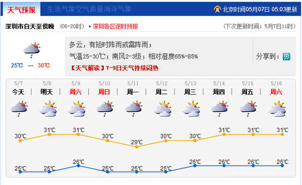 深圳连日来天气持续闷热有雨,预计7~9日,我市天气持续保持多云闷热状态,有局地短时阵雨或雷阵雨。今年第6号台风“红霞”5天内对我市无影响。
