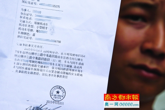 被追尾者展示交警处罚单,上书肇事者醉驾。 记者 赵炎雄 摄