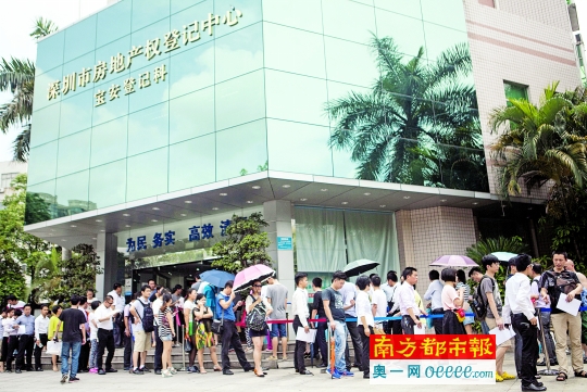 昨日下午,深圳房地产权登记中心宝安登记科门外排满了准备办理二手房过户的市民。记者 霍健斌 摄