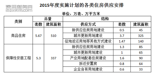 根据《计划》,2015年深圳市新增安排建设商品住房5.67万套、建筑面积510万平方米。其中,新供应用地建设0.5万套、建筑面积约45万平方米,城市更新用地安排建设3.7万套、建筑面积约325万平方米,征地返还用地等其他方式安排建设1.47万套、建筑面积约140万平方米。