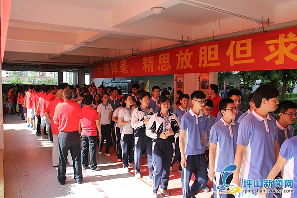 8点10分,坪高20个毕业班九百多名学生在班主任的引导下站好队伍,准备入场。8点15分,学校所有校领导和高三任课老师在走廊上站成两排,准备送考。8点20分,伴随着“我要上本科!”“坪高,必胜”的加油口号,学生们踏上红地毯,按班级顺序依次进入考场,边走边和身边送考的科任老师击掌打气。这边,老师对着同学说“120分加油!”“满分加油!”后面同学调皮回应:“老师我也要满分!”轻松愉快的氛围中,8点40分,所有考生全部进入到自己的考场。