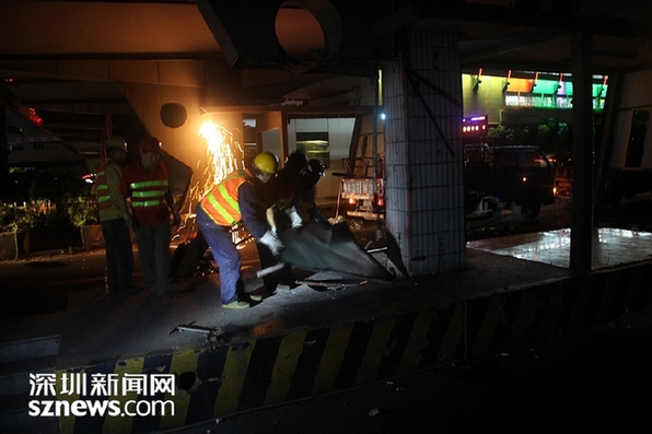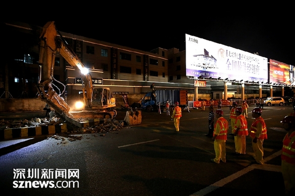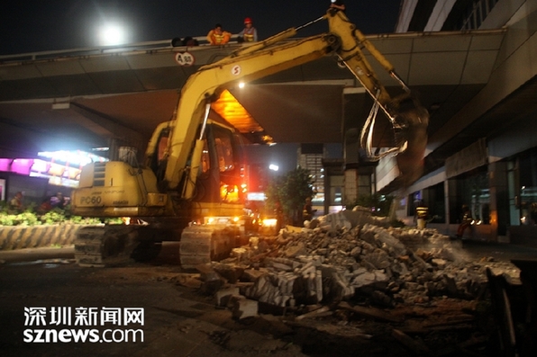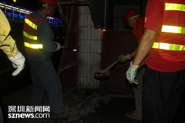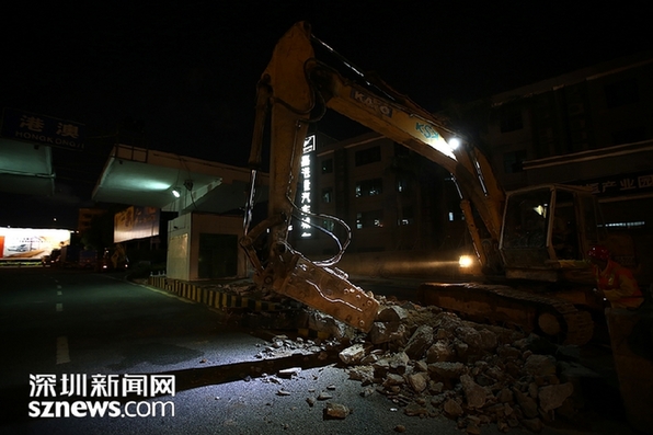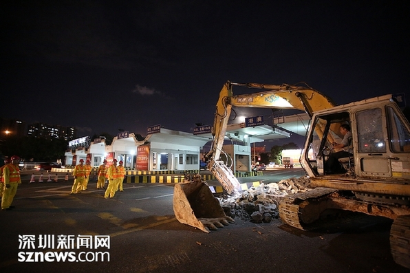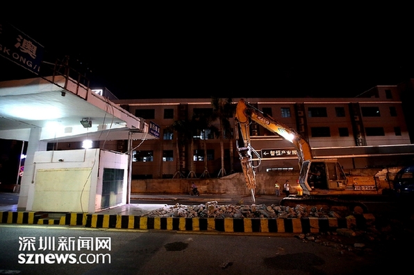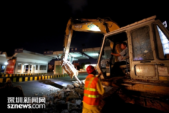 包括同乐、南头和布吉检查站的二线关车检通道拆除工作在6月4日晚上9点半同时进行。图为南头检查站车检通道拆除作业现场。