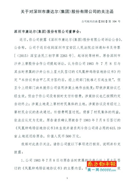 在发布筹划重大资产重组停牌公告两个月之后,深圳上市公司康达尔11月10日披露的一项诉讼公告,因涉及沙井615亩土地的所有权纠纷,再度引发股民的担忧。这一诉讼公告也引来了深交所的关注,并发函要求康达尔披露“涉案土地返还价款500万元的确认依据以及是否涉嫌低价收回上市公司资产、侵害上市公司股东利益的情形”。