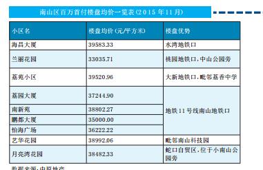 地铁11号线南山地铁口,鹏都大厦成为价格较低的二手房,3.5万元/平方米的价格成为众多刚需青睐的楼盘。荔园大厦、怡海广场、南新苑等楼盘价格在3.6~3.8万元/平方米,如果市民选择合适的户型、楼层,仍可以实现百万首付。