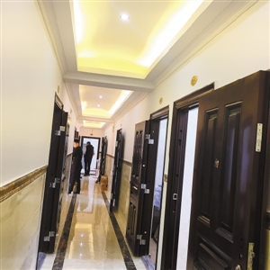 小产权房售楼中心,销售人员带置业者参观样板房。