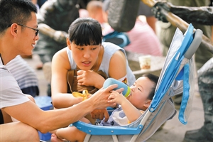 “全面两孩”拟于明年元旦落地。图为福州出行的家长正在给小孩喂水。(资料图片)