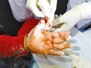 救援人员手指被铁皮划破,急救中心工作人员给他做简单的包扎。