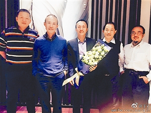 12月22日晚,万科董事长王石和董秘谭华杰等人,在深圳为万科总裁郁亮庆贺50岁生日并合影留念。