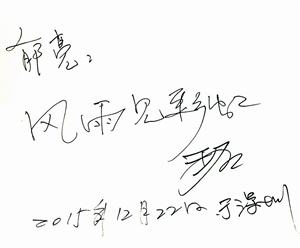 12月23日凌晨1点多,王石在个人微博和微信朋友圈分别上传了合影和签名。五人合影中,郁亮手捧鲜花,大家神态放松。合影照片背后王石亲笔写道:“郁亮:风雨见彩虹。王石 2015年12月22日于深圳”。