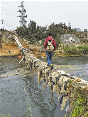 ④ 2015年12月30日上午,深圳晚报记者正在茅洲河塘尾村河段徒步,沿岸有大量生活垃圾。
