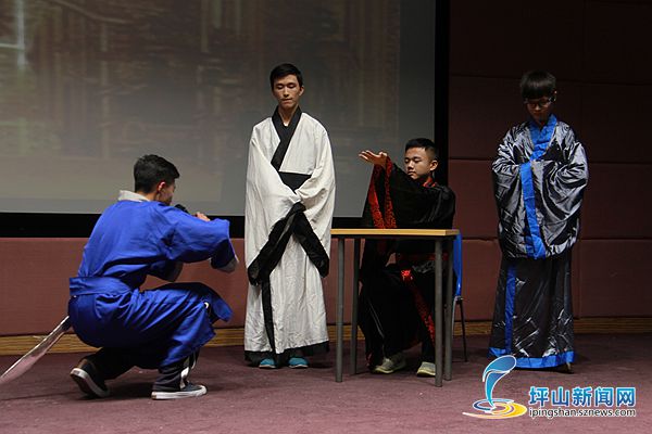 “感谢学校给我们这样一个展现自己的机会!”《赵氏孤儿》中屠岸贾的扮演者高二(4)班吕品弘在表演后的访谈环节激动的说到:“虽然这是‘老三套’,但真的感谢学校,感谢老师,感谢观众们!”