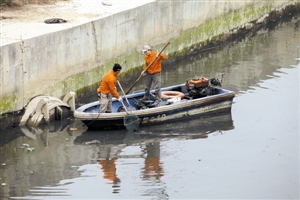 近日,茅洲河下游一处河道漂浮着垃圾,工作人员正进行打捞作业。
