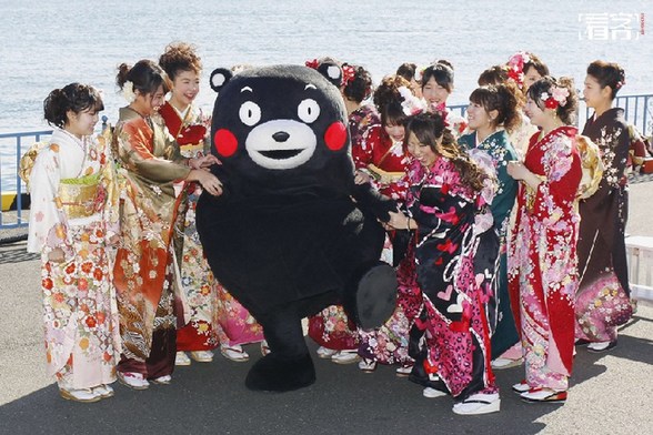 除此之外,县政府使得“熊本熊”的拟人化程度达到前所未有的高度。在日本民众的眼里,“熊本熊”不止是一个用布料和棉花制作出来的吉祥物玩偶,更是一个真实存在的个体。“他”的官方身份为熊本县的公务员,职衔为营业部长兼幸福部长,由于减肥失败于2015年一度被降职至代理营业部长,在日本各地甚至远赴海外出席宣传活动。图为当地时间2014年1月10日,日本东京,导游小姐身穿和服,与熊本县的吉祥物“熊本熊”一起拍照,提前庆祝“成人节”。