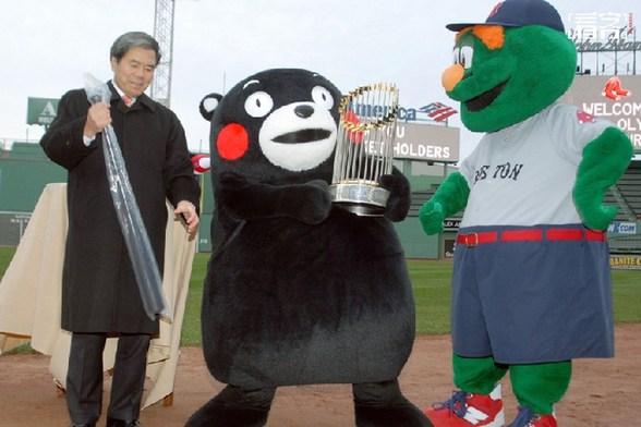 当地时间2013年11月12日,美国马萨诸塞州,熊本县知事蒲岛郁夫和吉祥物“熊本熊”与波士顿红袜队吉祥物“沃利”一起出席波士顿芬威球场活动。