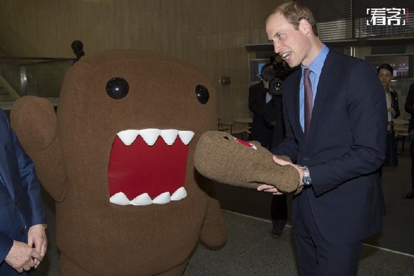当地时间2015年2月28日,日本东京,剑桥公爵威廉王子在其访问日本的第三天参观NHK电视台公共广播工作室时与日本NHK电视台吉祥物Domo合影。