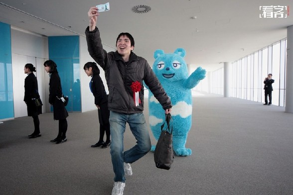 当地时间2014年3月7日,日本大阪市,由Kintetsu公司运营的Abeno Harukas大楼观景台的第一位游客与大楼的吉祥物Abenobear一起向媒体展示了他的参观票。2014年3月7日,日本最高的建筑在大阪开业,超越东京附近的置地大厦,作为亚洲第三大都市圈来吸引游客和企业。