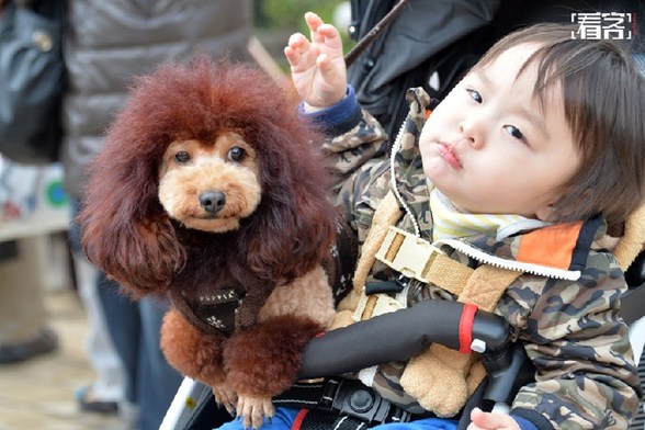 当地时间2014年4月5日,东京三越百货门前,一条修剪的像狮子一样的小狗蹲在它主人儿子的婴儿车边。当日,一百条看上去像狮子的小狗齐聚一堂,庆祝三越百货吉祥物狮子一百周年。