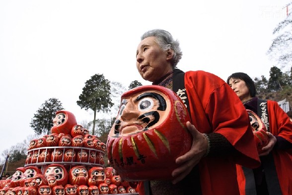 与招财猫相似,达摩吉祥娃娃(daruma)也属于日本传统吉祥物文化中的一员。图为当地时间2016年1月17日,日本岐阜,当地寺庙举行达摩吉祥娃娃焚烧仪式,10000只娃娃被烧掉。日本民众会在新年初始购买能够带来好运的达摩娃娃,然后这一年结束后将其烧掉。