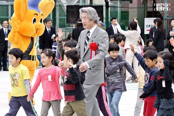 当地时间2006年4月10日,东京,日本前首相小泉纯一郎与东京警视厅交通安全吉祥物Pi-Po一起护送小学生穿过斑马线以纪念全国交通安全周活动。