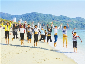 猴年春节假期,大批游客慕名来到素有“东方夏威夷”美誉的深圳小梅沙海滨赏海、观浪、戏水,享受大自然美景。图为一群大学生在美丽海滩上欢跃拍照留念。深圳晚报特约记者韦建诚 摄