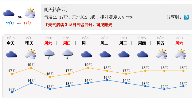 今日仍以多云天气为主,部分时间可见阳光。市区维持2~3级风力,沿海风力3~4级,最大阵风6级以上。温差增大,早晚寒冷,最低气温11℃左右,白天最高气温17℃左右,北部及山地略低1℃。天气较干燥,空气湿度较低,最小相对湿度50%,最大湿度70%。