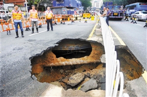 2013年8月30日,福田区新洲路和梅华路交界处发生地陷。(资料图片) 深圳商报记者 林晓斌 摄