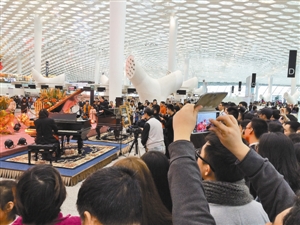 悠扬的钢琴声在机场航站楼响起,旅客们停下脚步,被旋律吸引。21日下午,深圳宝安国际机场·国际钢琴艺术馆——公益演出“大师贺新春”系列活动首次在深圳机场举行。87岁钢琴泰斗德慕斯和蔡崇力、来佳俊等3位大师分别进行了精彩的演奏。