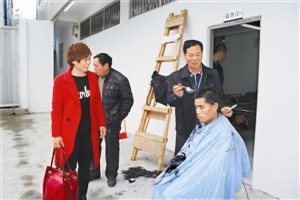 深圳市救助站救助管理部工作人员帮刘心勇剪发。 深圳晚报记者罗典 摄