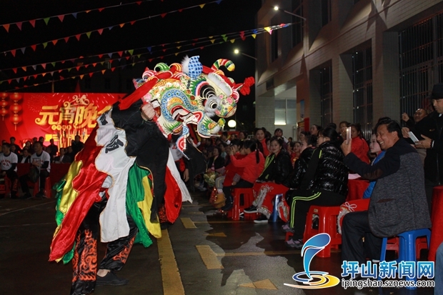 当天的晚会以寓意吉祥的坪山传统麒麟巡游拉开序幕,两只麒麟时而跳跃,时而俯身向观众点头,表示对观众的尊敬和祝福。紧接着麒麟队表演的“三门拳”及棍术表演赢得观众阵阵掌声。舞蹈《喜乐年华》、合唱《真心英雄》等节目陆续上演,一群年轻貌美的舞者跳起了《最美宫灯红》舞蹈,她们用大红灯笼及舞姿传递浓浓的元宵气氛,让在场观众大饱眼福,欢呼不断。整台晚会精彩纷呈,高潮迭起,最后,晚会在麒麟舞表演中落下帷幕。
