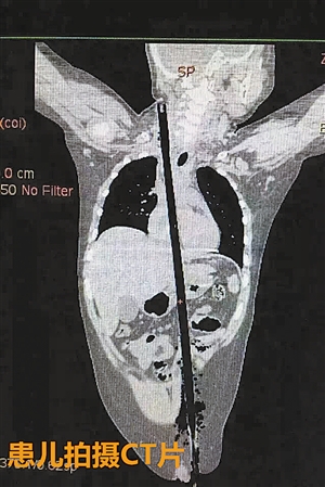 2月24日19时许,十岁男孩小郑从高处坠落,一支长约63cm,直径约1.5cm的竹棍不慎从他的左侧大腿根部插入腹腔并入胸腔直至右侧颈部,孩子疼痛难忍,命在旦夕。