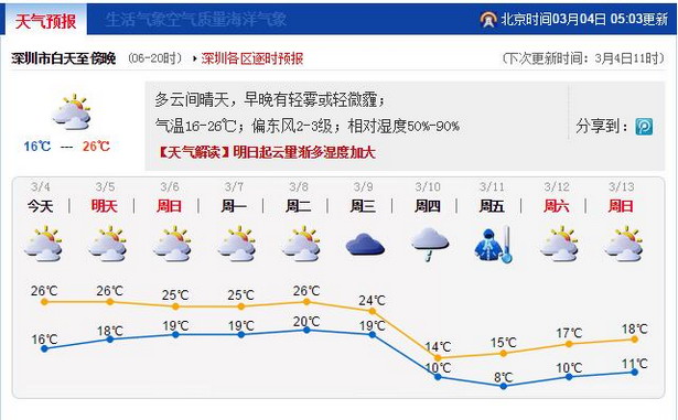 预计5-6日深圳云量持续增多、湿度增大,但部分时间仍可见阳光,气温继续回升,昼夜温差逐渐减小,天气逐转暖湿;7-9日天气以暖湿有雾天气为主,部分时间能见度较差;10-11日,深圳将受冷空气影响,转阴有小雨天气,全市气温将显著下降。(记者 史青玉)