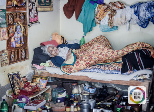 在印度新德里附近的沃林达文一间由政府运营的专门庇护所,一名寡妇躺在居室内的床上。(新华社记者毕晓洋摄)