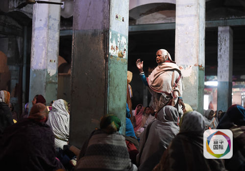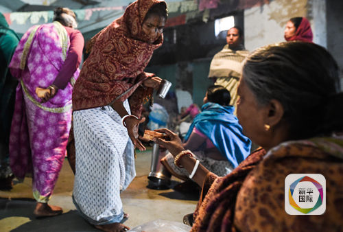 (颂唱间隙,寡妇们会排队从神庙工作人员手里领取简餐:两片甜面包干,一杯加奶的茶水。新华社记者毕晓洋摄)