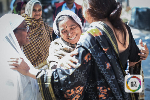 在一间政府运营的庇护所,一名寡妇拥抱前来探访的公益组织“苏拉布”成员。“苏拉布”每月向近千名寡妇提供每人2000卢比(约合人民币190元)的补助。(新华社记者毕晓洋摄)
