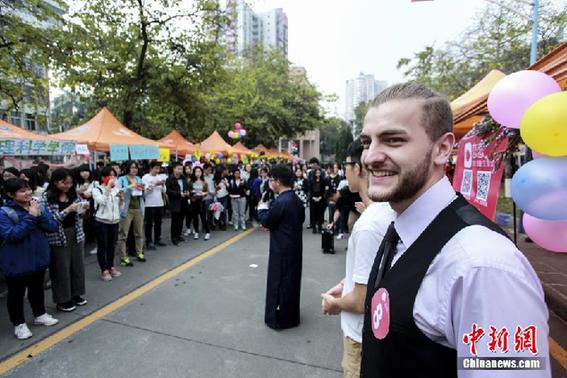 3月6日,华南师范大学的俄罗斯留学生乐天参加“女生节”的“竞拍男生”活动。当日,华南师范大学在校园内举办“竞拍男生”等活动庆祝“女生节”,女学生通过虚拟货币“竞拍男生”,与心仪的男学生互动。中新社记者王庆然 摄