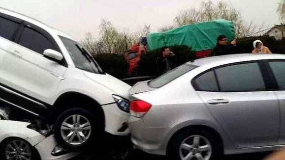南京九车连环相撞 一车被顶起“爬”上车顶