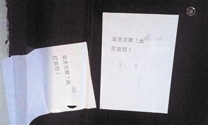 卖家深圳市通全球公司法人代表龙静在公寓大门上张贴的“业主欠款!此房在打官司!”标语。受访者供图