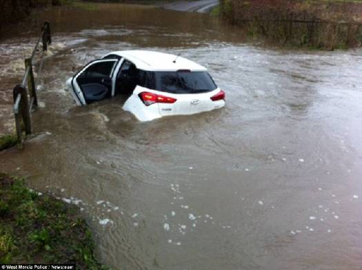 赫里福郡,被困在洪水里的车。