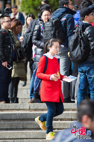 【淡定之美】2016年两会,人民大会堂前,身穿娃娃领红色上衣的一名女记者匆匆走过人群。中国网 郑亮 摄