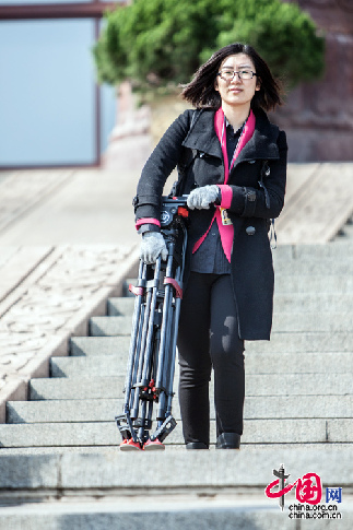 【独立之美】2015年3月5日,第十二届全国人大第三次会议开幕,一名女记者正准备入场,玫红外套上面的黑色大衣也遮盖不了这一抹亮色。中国网郑亮 摄