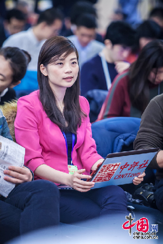 【温婉之美】2015年两会,身穿正红小西装的第一财经美女记者在会议上提问。中国网 杨佳 摄